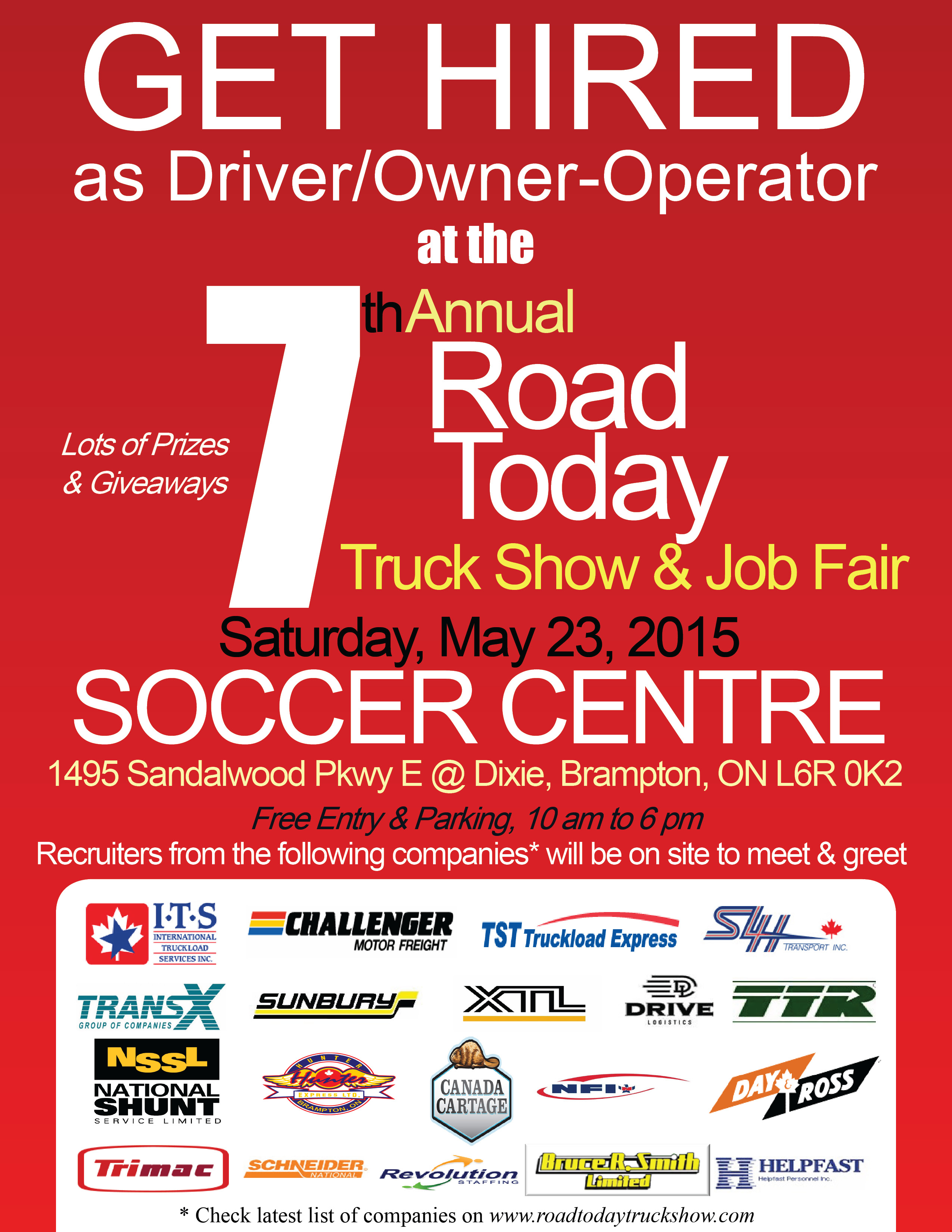 Hiring of drivers and owner-operators will be in full swing as Canada’s leading trucking companies and recruiters will be on site to share available opportunities. Special prizes and gifts will be raffled for commercial drivers. These include 42” Smart TV, GPS systems and much more.