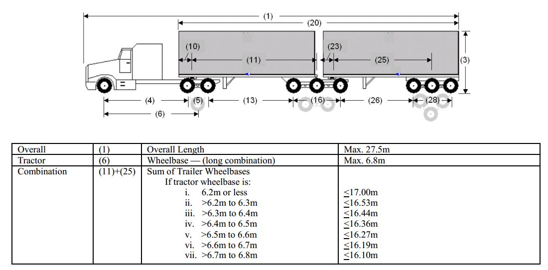 The extended tractor b-train double trailer must meet all Safe, Productive, Infrastructure-Friendly (SPIF) requirements, except with overall length of 27.5 metres. The tractor wheelbase also has a maximum of 6.8 metres. For this configuration as tractor wheel-base increases, it is offset by reducing the sum of the trailer wheelbases according to the following trade-off table. There is no change in the 20 metre box length limit for the configuration. This formula allows the configuration to turn within the same space as a regular tractor single semi-trailer configurations.