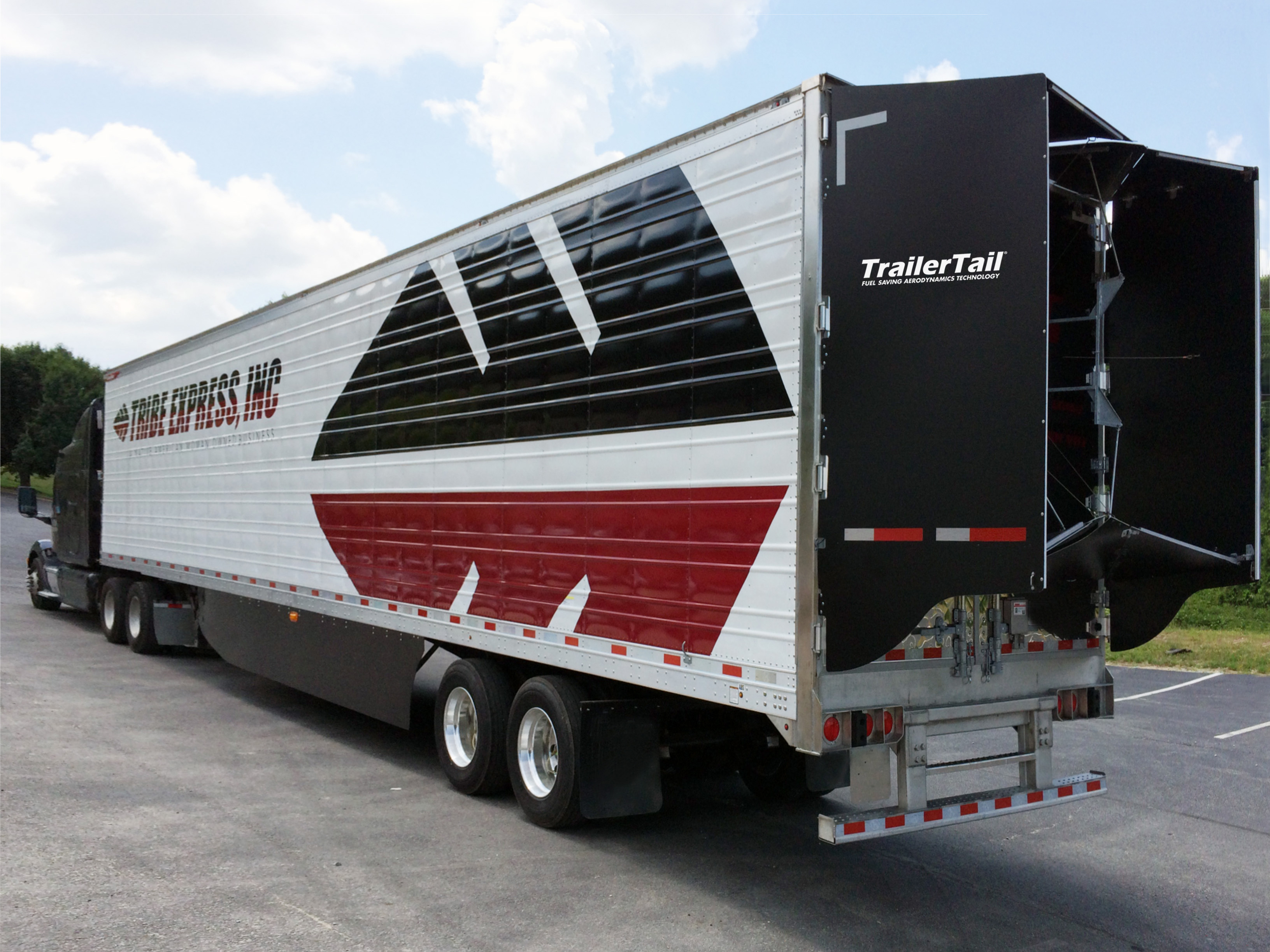 ATDynamics TrailerTail technology streamlines airflow at the rear of a semi-trailer to reduce aerodynamic drag. The patented folding origami designs can be installed on a semi-trailer in under 45 minutes and deploy automatically at highway speed to enhance vehicle aerodynamics, fuel economy and safety.