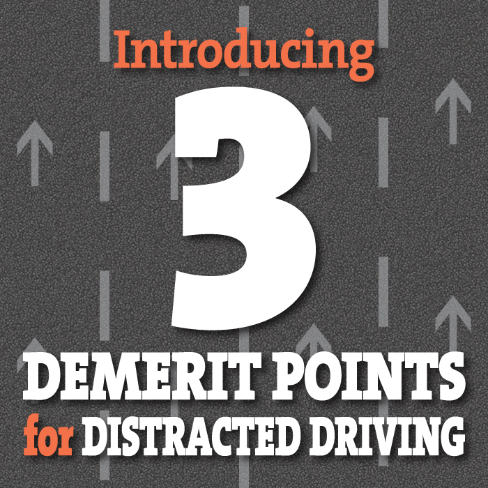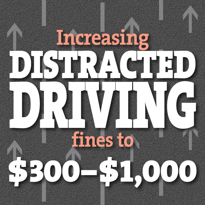 - Increase fines for distracted driving from the current range of $60 to $500 to a range of $300 to $1,000, assigning three demerit points upon conviction, and escalating sanctions on convictions for novice drivers