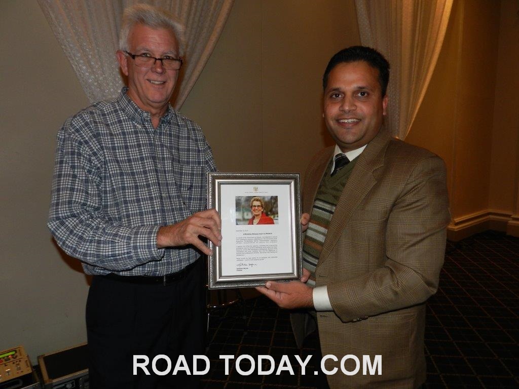 Wynne applauded the ATSSA for exploring, promoting and implementing procedures meant to enhance commercial vehicle safety and foster fellowship among fleet maintenance professionals.  She congratulated the ATSSA for providing its members the opportunity to establish their professional networks, and further their training and development.  Premier’s congratulatory certificate was presented by Manan Gupta, Publisher, Road Today Media Group to Dan Cushing, President ATSSA Toronto.