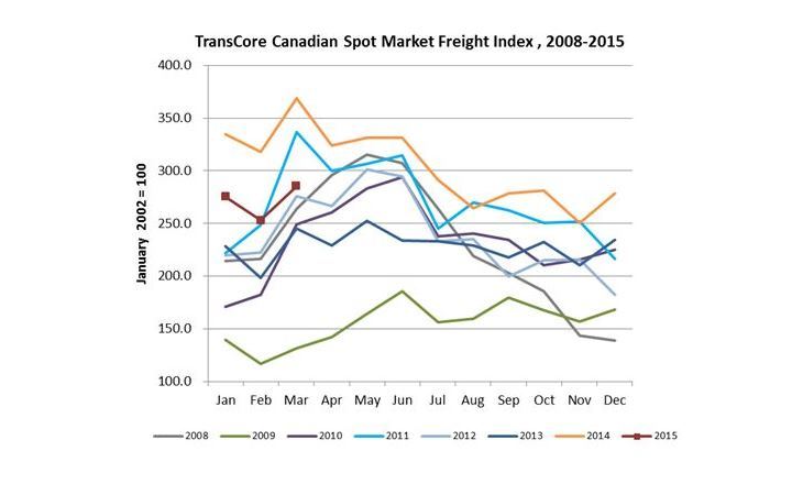 TransCore Link Logistics Canadian Freight Index volumes for the first quarter of 2015 peaked in March surpassing February volumes by 13 percent and closing the first quarter on a high. Year-over-year load volumes, however, fell 23 percent compared to 2014.